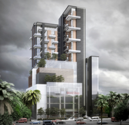 商务楼酒店(Monishop) 这是一栋商用综合体楼,由刚果金Monishop公司及XSML公司共同投资,集酒店、办公、大型超市、银行、商场、餐饮、药店等各行业为一体。2层地下室+13层楼商务楼和酒店,总建筑面积15,006平米,总高度63.5米,另有两层地下室,主体施工约14个月,造价 1150万美元。
