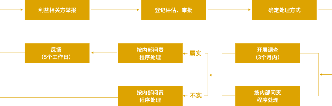 我们为利益相关方提供了申诉与举报机制,适用于所有利益相关方群体,涵盖公司所有经营活动,并通过《举报管理政策声明》和《举报管理办法》对举报工作进行了规范,以确保利益相关方的诉求能得到及时有效的处理,保障申诉人权益,规范申诉处理工作。